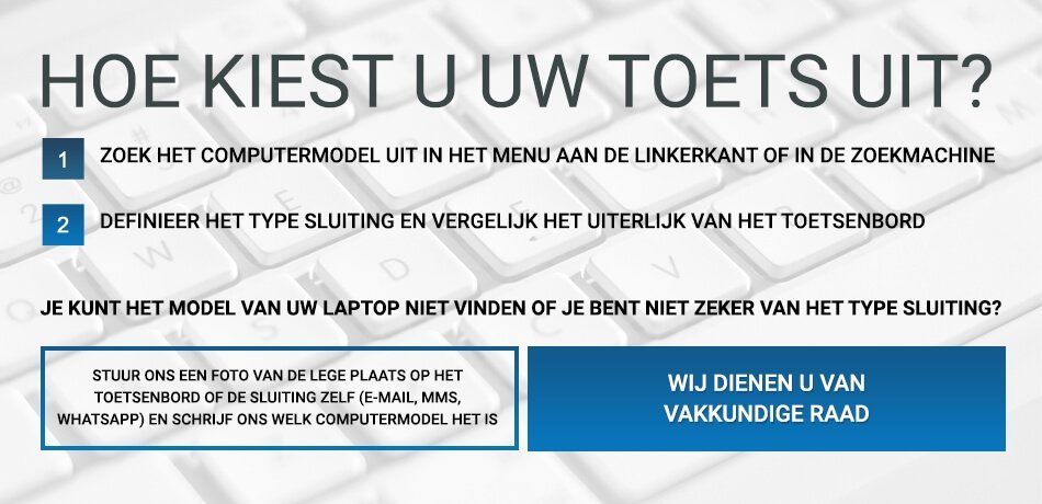 Is je toetsenbord van Acer, Apple, Asus, Dell, Lenovo, Gateway, HP, Medion, MSI, Samsung, Sony, Toshiba of een andere producent kapot? Ben je er niet zeker van welke toets bij de laptop zal passen? Ben je er niet zeker van of de clip identiek is die van jouw apparaat? Weet je niet hoe een toets gemonteerd moet worden? Heb je een reserve-toets besteld, maar kan je in de winkel niet het model van je apparaat vinden? Neem dan contact met ons op. Wij helpen u graag.