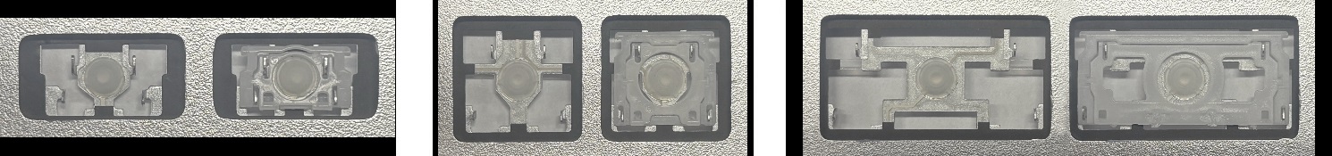 - Om het juiste model te kiezen, vergelijk de lege plek op jouw toetsenbord met de onderstaande foto’s, of verwijder de toets “A” – daaronder zit altijd een middelgrote clip.