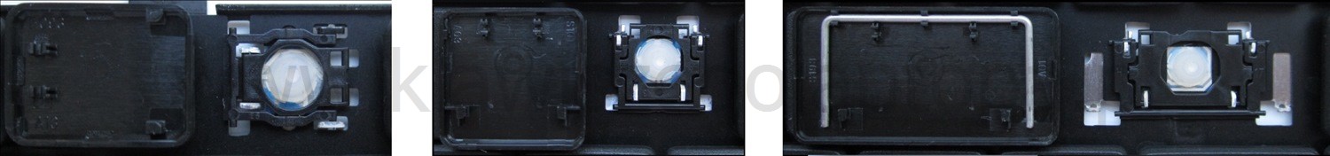 - Om het juiste model te kiezen, vergelijk de lege plek op jouw toetsenbord met de onderstaande foto’s, of verwijder de toets “A” – daaronder zit altijd een middelgrote clip.