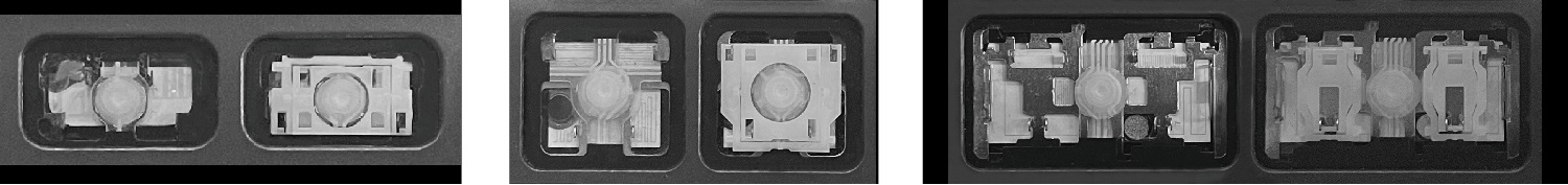 - Bij de meeste toetsenborden die er van buiten identiek uitzien, werden verschillende soorten clips onder de toetsen gebruikt.