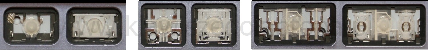 - Om het juiste model te kiezen, vergelijk de lege plek op jouw toetsenbord met de onderstaande foto’s, of verwijder de toets “A” – daaronder zit altijd een middelgrote clip.