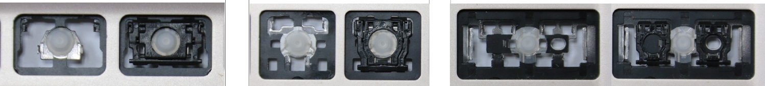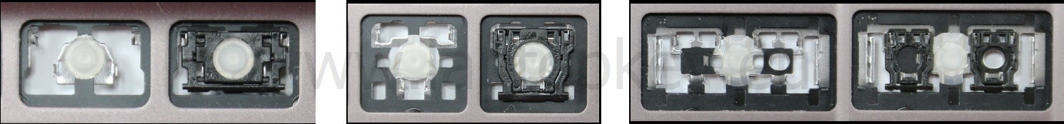 - Om het juiste model te kiezen, vergelijk de lege plek op jouw toetsenbord met de onderstaande foto’s, of verwijder de toets “A” – daaronder zit altijd een middelgrote clip.