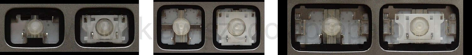 - Om het juiste model te kiezen, vergelijk de lege plek op jouw toetsenbord met de onderstaande foto’s, of verwijder de toets “A” – daaronder zit altijd een middelgrote clip.