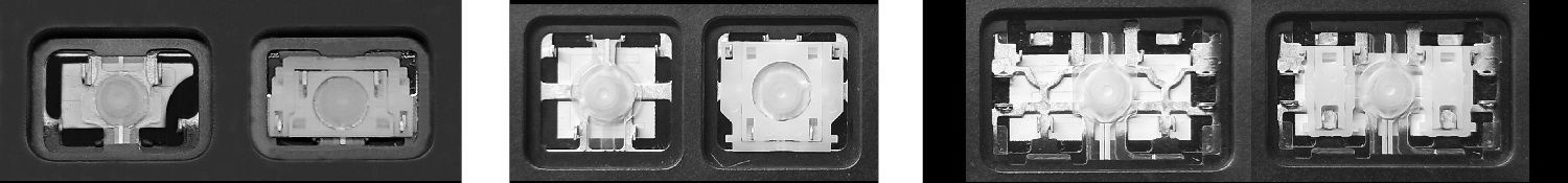 - Bij de meeste toetsenborden die er van buiten identiek uitzien, werden verschillende soorten clips onder de toetsen gebruikt.
