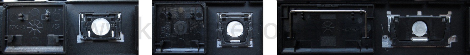 - Om het juiste model te kiezen, vergelijk de lege plek op jouw toetsenbord met de onderstaande foto’s, of verwijder de toets “A” – daaronder zit altijd een middelgrote clip.