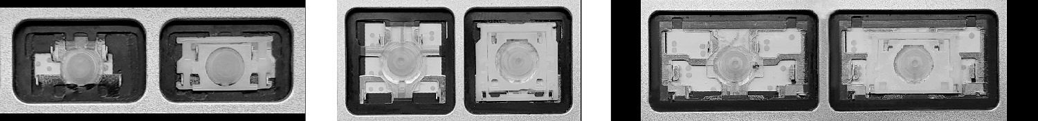 - Om het juiste model te kiezen, vergelijk de lege plek op jouw toetsenbord met de onderstaande foto’s, of verwijder de toets “A” – daaronder zit altijd een middelgrote clip.