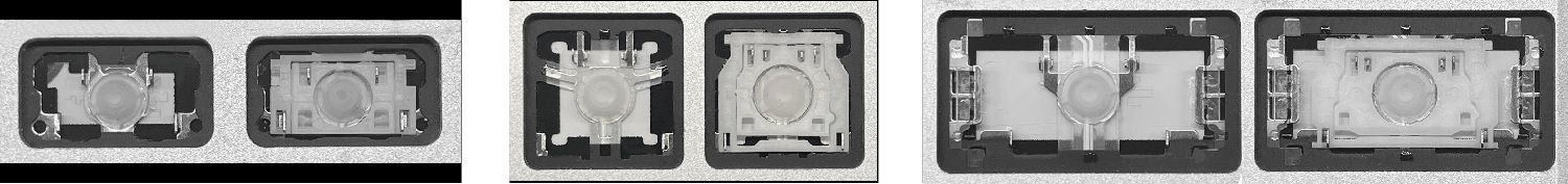 - Bij de meeste toetsenborden die er van buiten identiek uitzien, werden verschillende soorten clips onder de toetsen gebruikt.