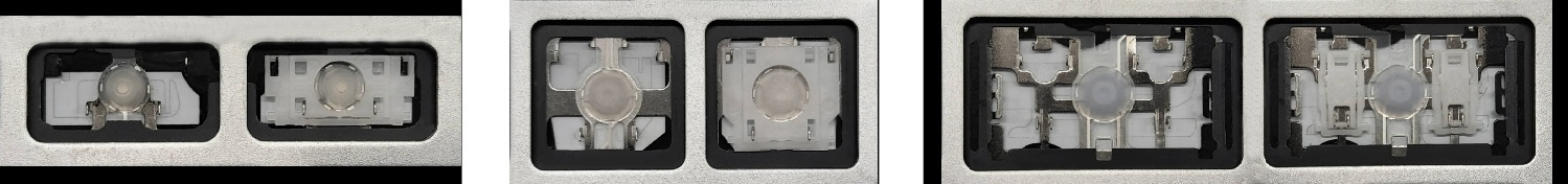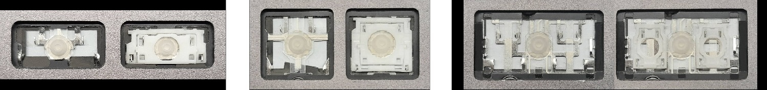 - Om het juiste model te kiezen, vergelijk de lege plek op jouw toetsenbord met de onderstaande foto’s, of verwijder de toets “A” – daaronder zit altijd een middelgrote clip.