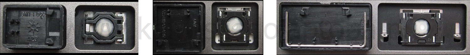 - Om het juiste model te kiezen, vergelijk de lege plek op jouw toetsenbord met de onderstaande foto’s, of verwijder de toets “A” – daaronder zit altijd een middelgrote clip.