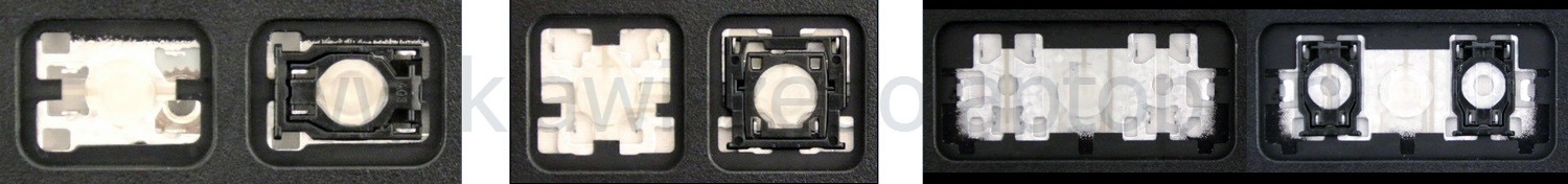 - Om het juiste model te kiezen, vergelijk de lege plek op jouw toetsenbord met de onderstaande foto’s, of verwijder de toets “A” – daaronder zit altijd een middelgrote clip.
