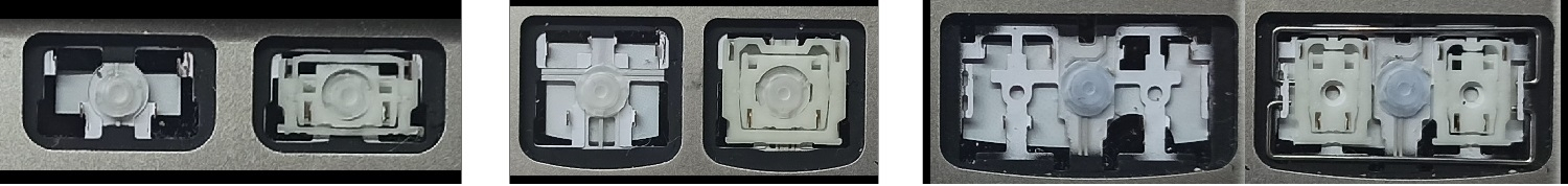 - Om het juiste model te kiezen, vergelijk de lege plek op jouw toetsenbord met de onderstaande foto’s, of verwijder de toets “A” – daaronder zit altijd een middelgrote clip.