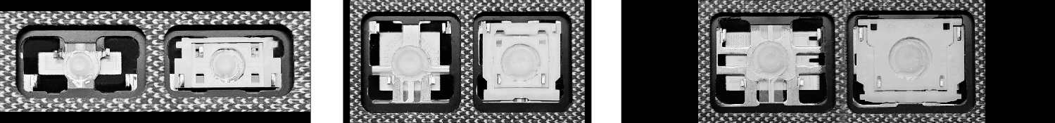 - Om het juiste model te kiezen, vergelijk de lege plek op jouw toetsenbord met de onderstaande foto’s, of verwijder de toets “A” – daaronder zit altijd een middelgrote clip.