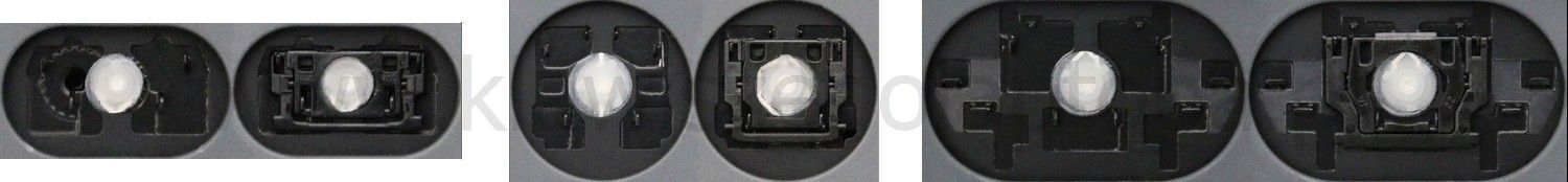 - Om het juiste model te kiezen, vergelijk de lege plek op jouw toetsenbord met de onderstaande foto’s, of verwijder de toets “A” – daaronder zit altijd een middelgrote clip.
