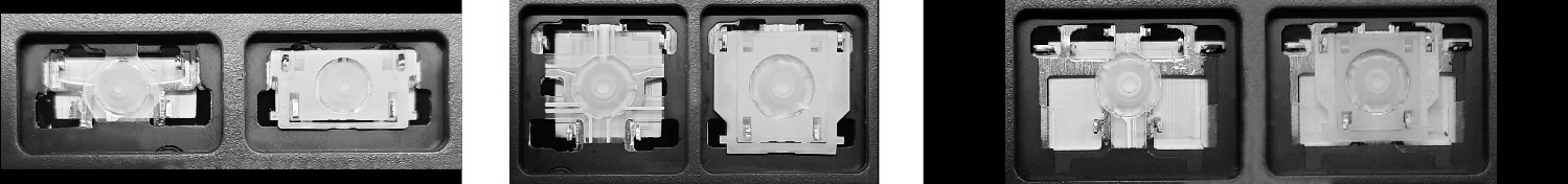 - Om het juiste model te kiezen, vergelijk de lege plek op jouw toetsenbord met de onderstaande foto’s, of verwijder de toets “A” – daaronder zit altijd een middelgrote clip.