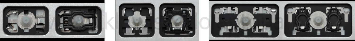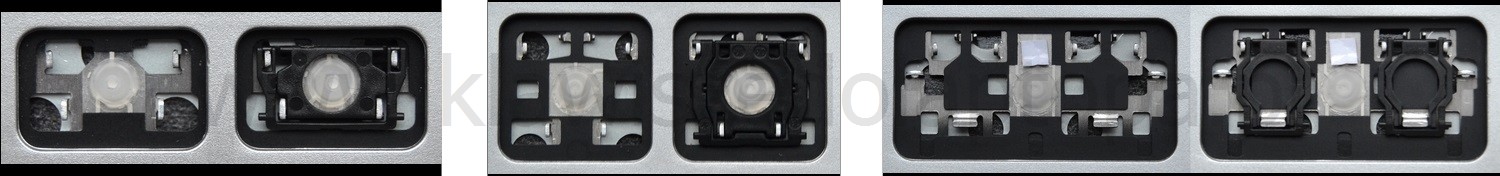 - Om het juiste model te kiezen, vergelijk de lege plek op jouw toetsenbord met de onderstaande foto’s, of verwijder de toets “A” – daaronder zit altijd een middelgrote clip.